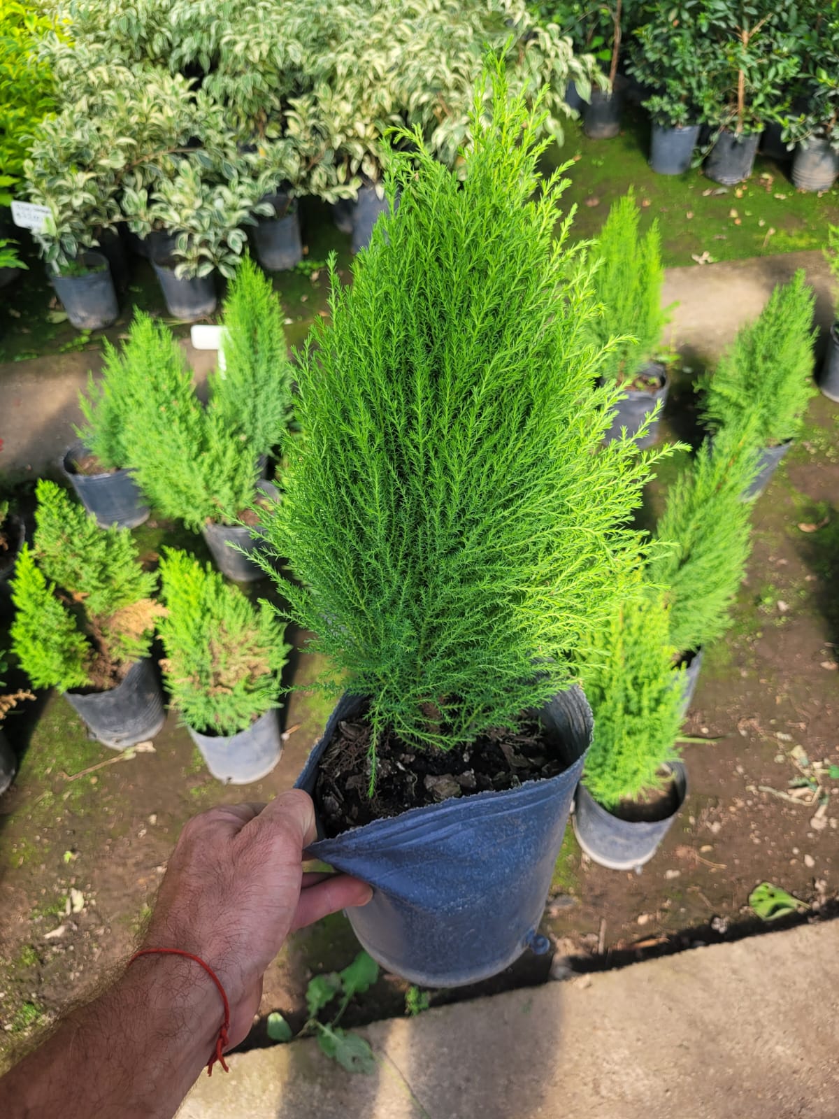 Pino Lemon (Cupressus macrocarpa ‘Goldcrest’) en maceta 3 L. Conífera de follaje perenne con un distintivo aroma cítrico y color verde amarillento, ideal para aportar luz y frescura a patios o interiores muy luminosos.